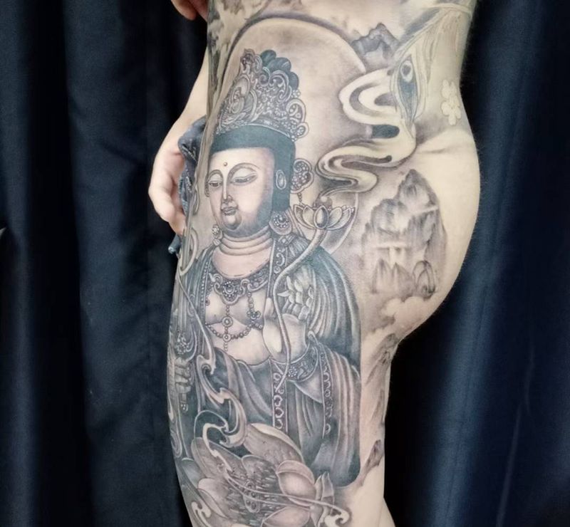 虚空藏菩萨纹身图片_腿部腰部新传统人物,神佛纹身图案