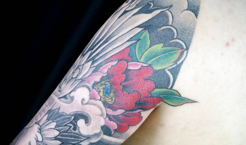 仙鹤,牡丹花臂纹身图片_手臂手部老传统水彩纹身图案