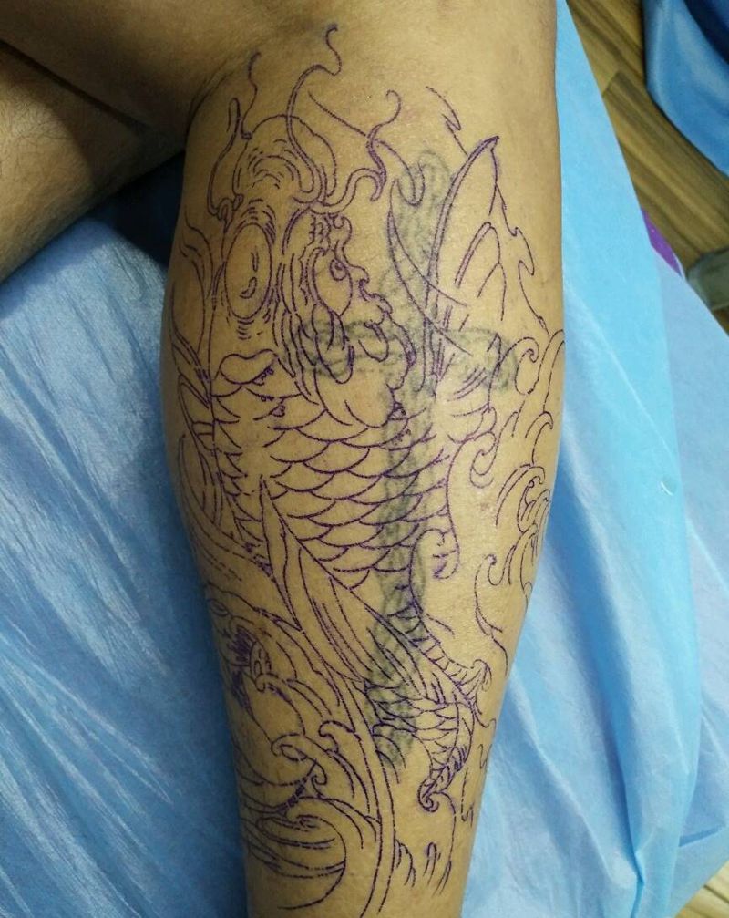 • T网红王老大花腿龙纹身图片_腿部新传统纹身图案