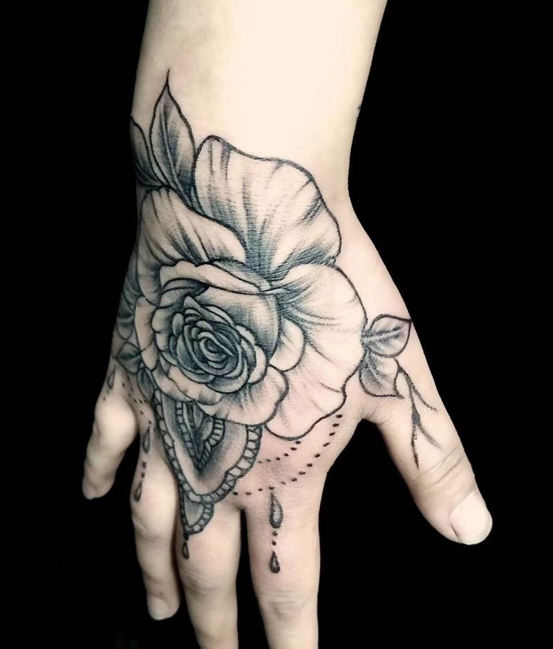 • 手背潮流时尚的玫瑰花眼睛纹身图案