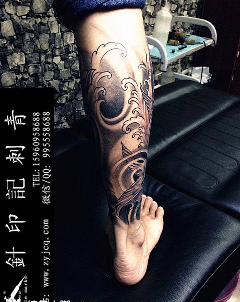 包小腿鲤鱼纹身图片_成品腿部传统动物纹身图案