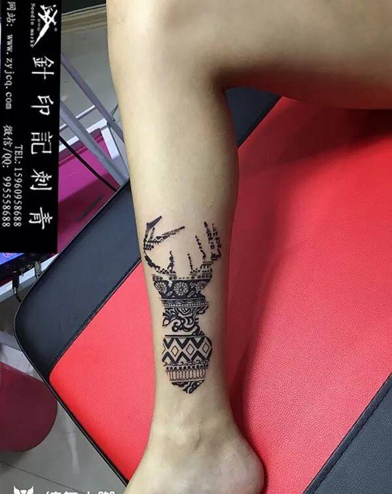 鹿纹身图片_成品腿部传统图腾纹身图案