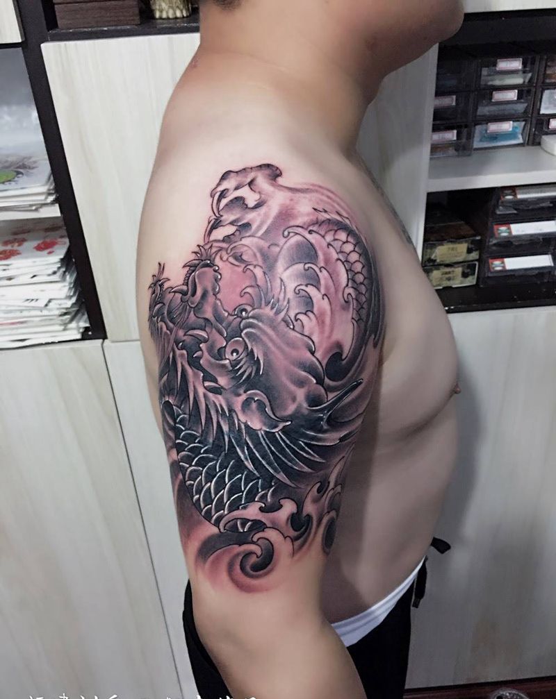 • T网红王老大花腿龙纹身图片_腿部新传统纹身图案