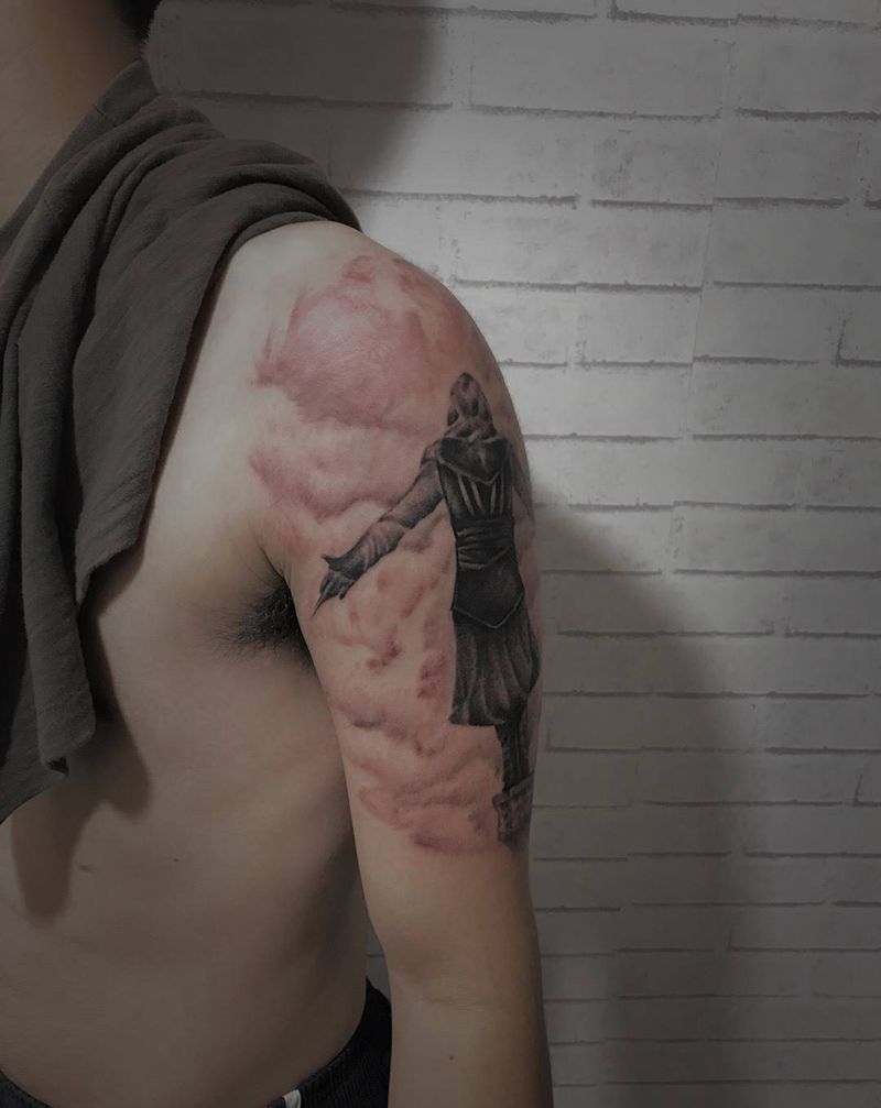 当前位置: 首页 >福建省三明市纹身店-福建沙县针印记刺青纹身图案>刺客信条纹身图片_成品手臂写实人物纹身图案