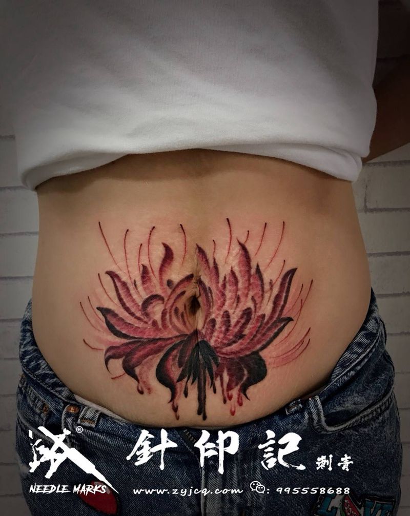 妊辰纹遮盖纹身图片_成品腹部传统植物花纹身图案