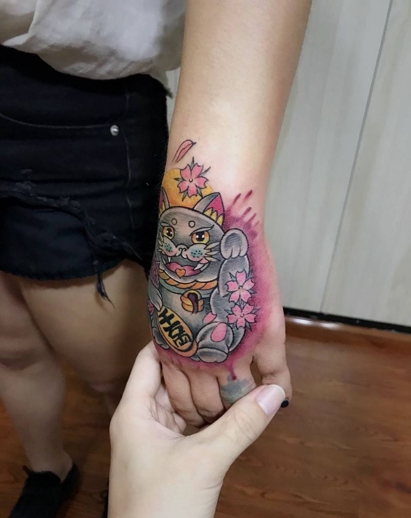 招财猫纹身图片_成品手部欧美动物纹身图案