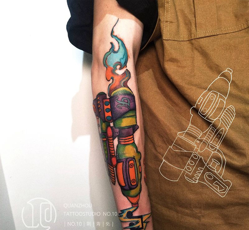 当前位置: 首页 >福建省泉州市纹身店-10号刺青处纹身图案>小丑水枪纹身图片_手臂New School纹身图案