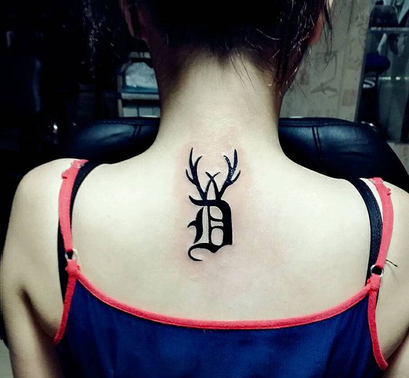 当前位置: 首页 >福建省三明市纹身店-福建永安盘古纹身纹身图案>鹿角、字纹身图片_颈部欧美字符图腾原创纹身图案