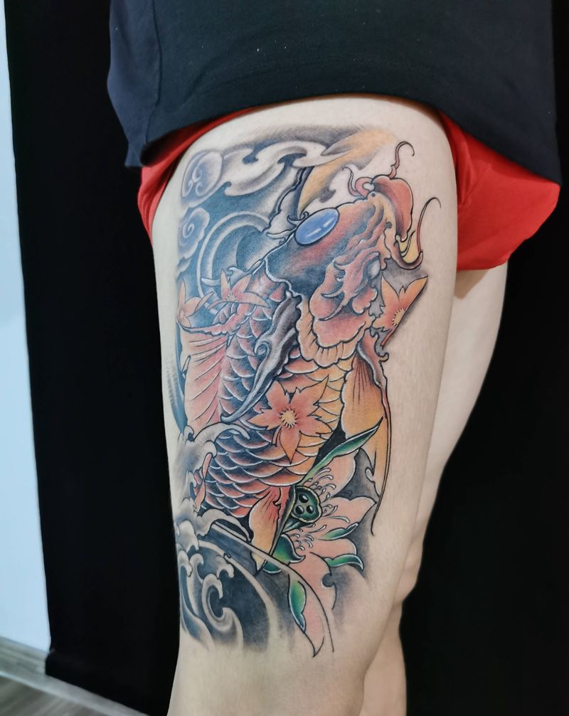 当前位置: 首页 >福建省泉州市纹身店-泉州鹏海刺青纹身图案>鲤鱼遮盖旧纹身纹身图片_腿部新传统纹身图案
