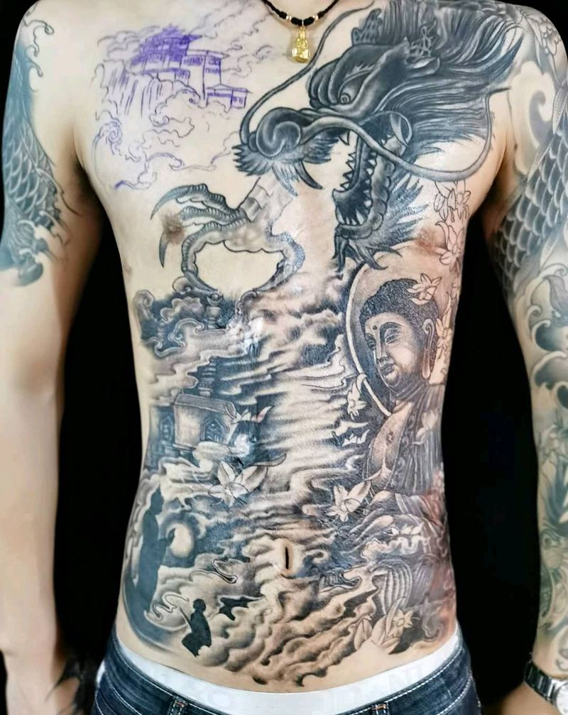 当前位置: 首页 >福建省泉州市纹身店-泉州鹏海刺青纹身图案>遮盖伤疤未完待续纹身图片_腹部胸部新传统纹身图案