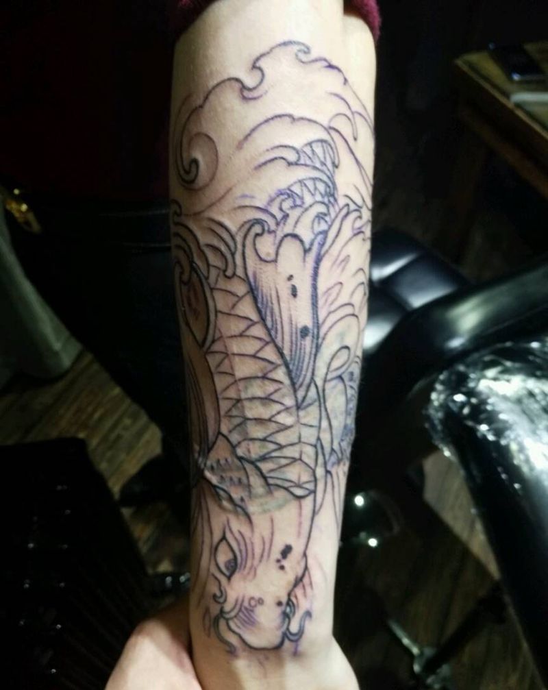 当前位置: 首页 >福建省泉州市纹身店-泉州鹏海刺青纹身图案>小臂鲤鱼遮盖旧纹身半成品纹身图片