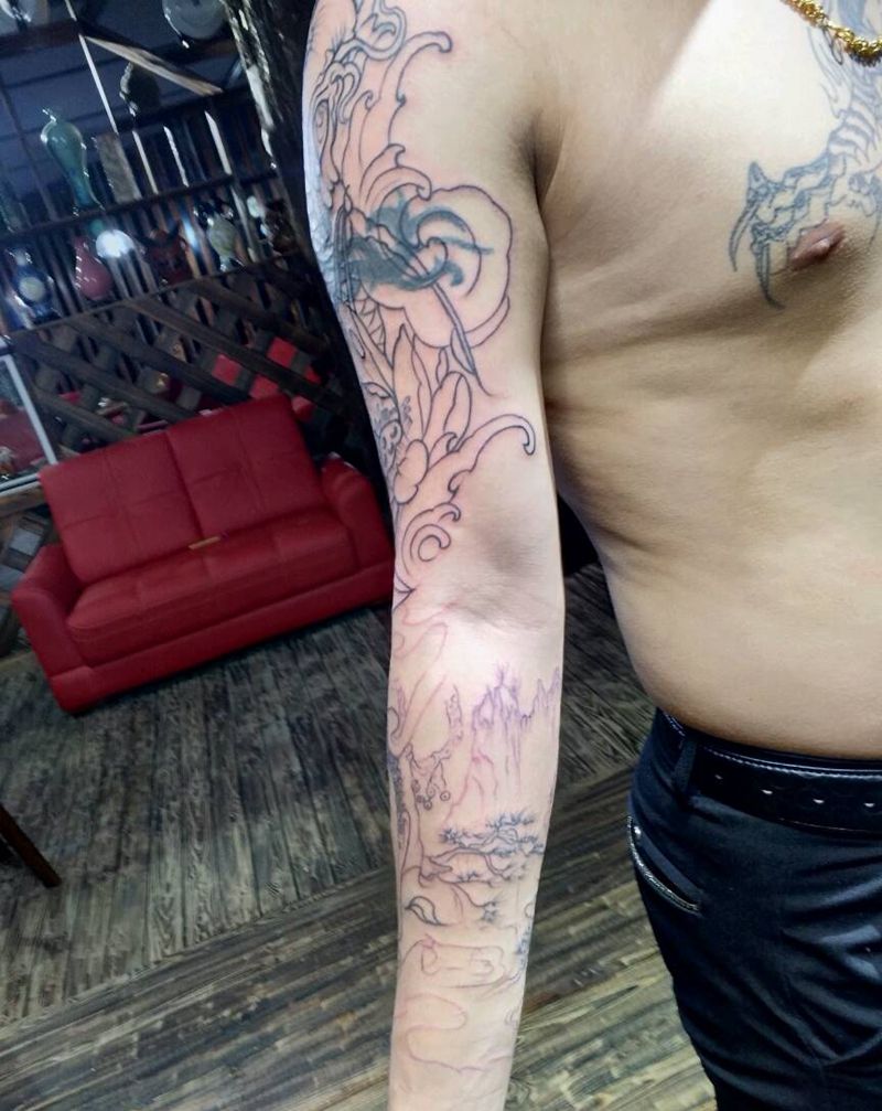 当前位置: 首页 >福建省泉州市纹身店-泉州鹏海刺青纹身图案>花臂遮盖旧纹身未完下次待续纹身图片