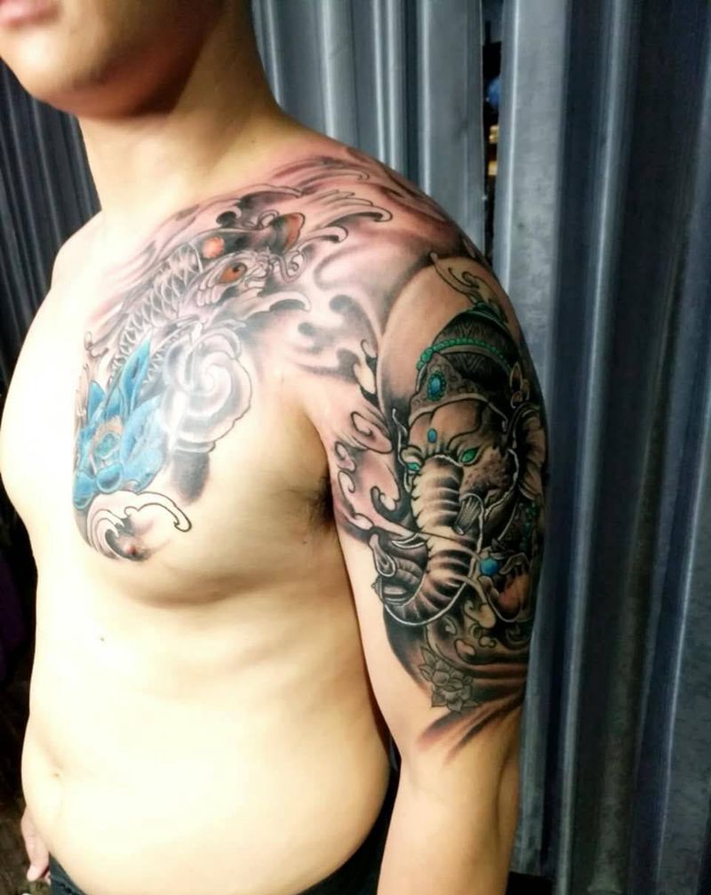 当前位置: 首页 >福建省泉州市纹身店-泉州鹏海刺青纹身图案>胸部遮盖完成做半甲纹身图片