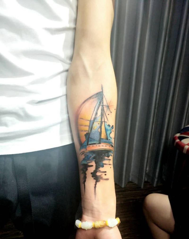 当前位置: 首页 >福建省泉州市纹身店-泉州鹏海刺青纹身图案>小臂泼墨 帆船纹身图片