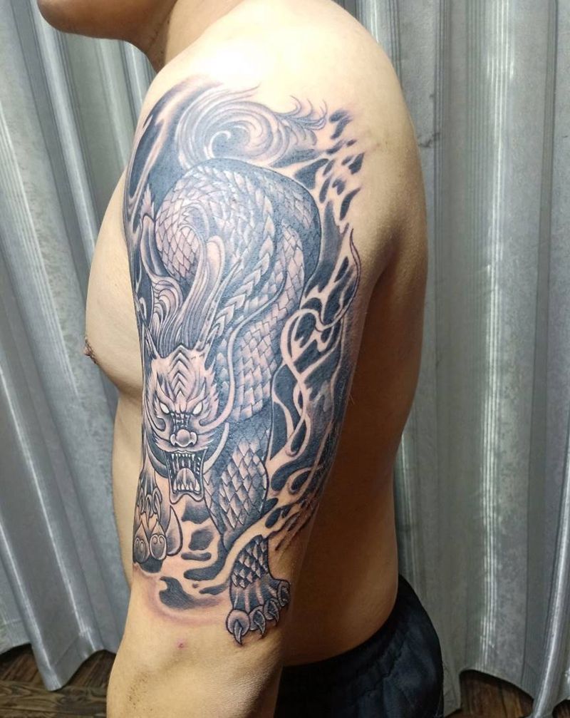 当前位置: 首页 >福建省泉州市纹身店-泉州鹏海刺青纹身图案>大臂麒麟纹身图片