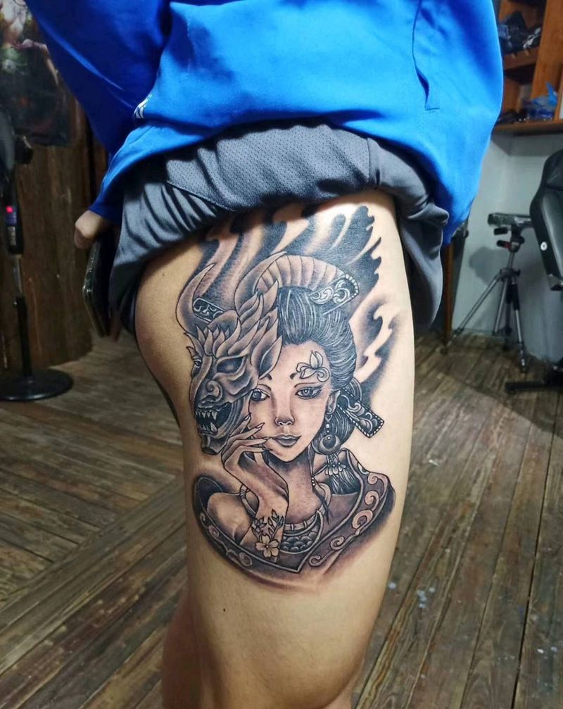 • T网红王老大花腿龙纹身图片_腿部新传统纹身图案