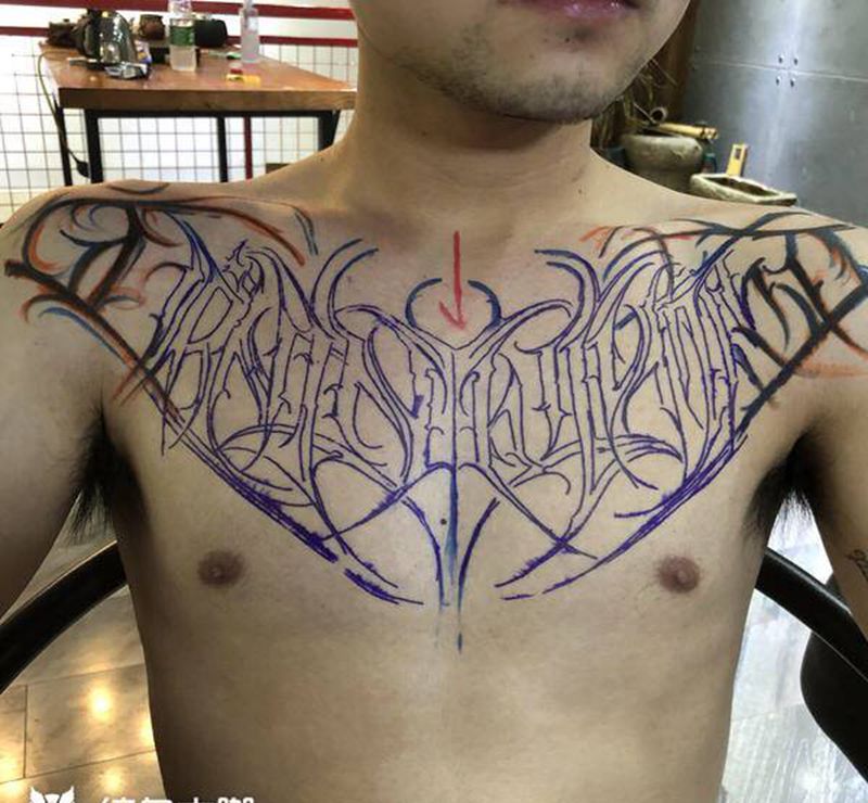 当前位置: 首页 >福建省泉州市纹身店-玛雅刺青纹身图案>花胸花体字纹身图片_胸部纹身图案
