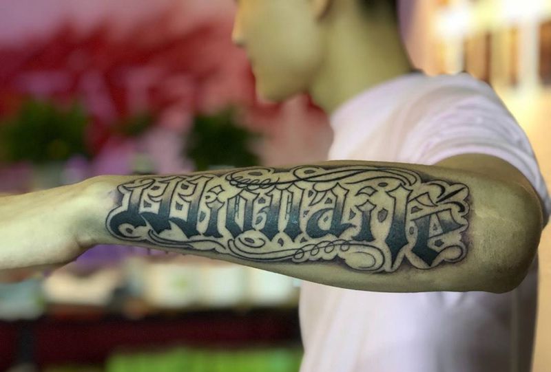 当前位置: 首页 >福建省泉州市纹身店-纯针刺青纹身图案>奇卡诺花体西海岸风格纹身图片_手臂花体字纹身图案