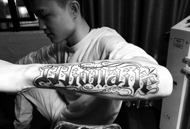 当前位置: 首页 >福建省泉州市纹身店-纯针刺青纹身图案>奇卡诺花体西海岸风格纹身图片_手臂花体字纹身图案