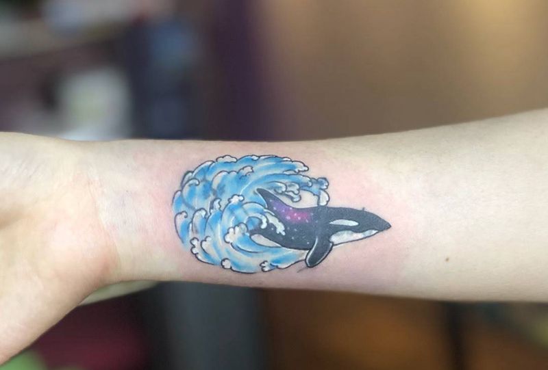 当前位置: 首页 >福建省泉州市纹身店-纯针刺青纹身图案>星空鲸鱼海浪纹身图片_手臂手部水彩纹身图案