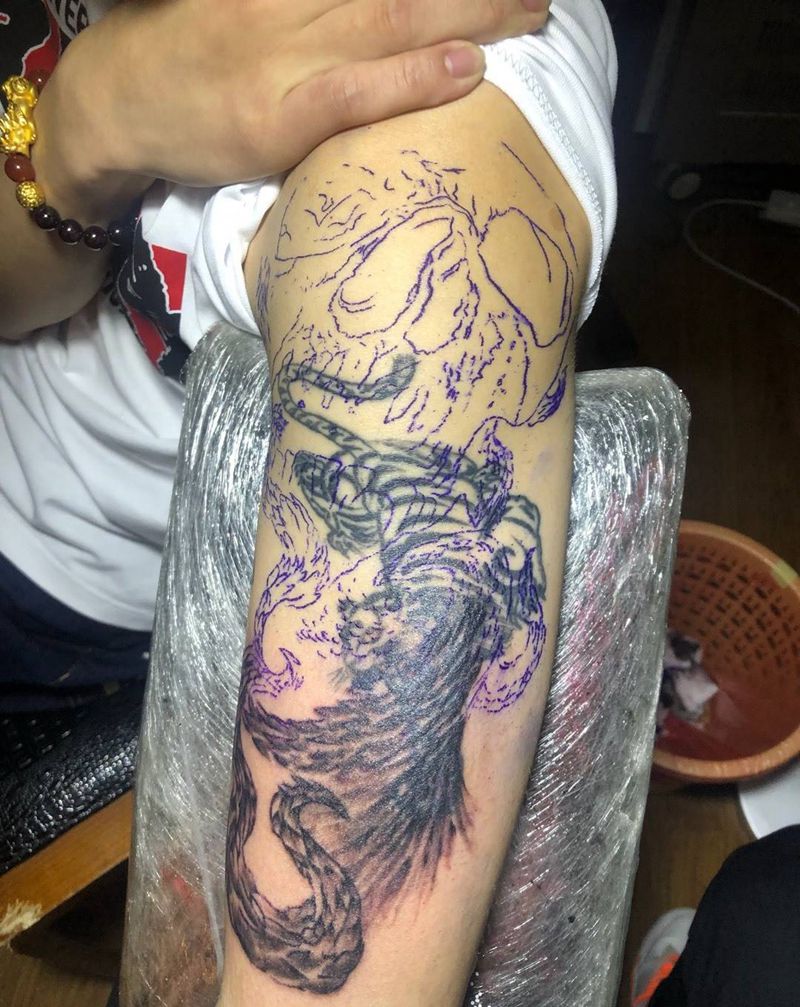 • T网红王老大花腿龙纹身图片_腿部新传统纹身图案