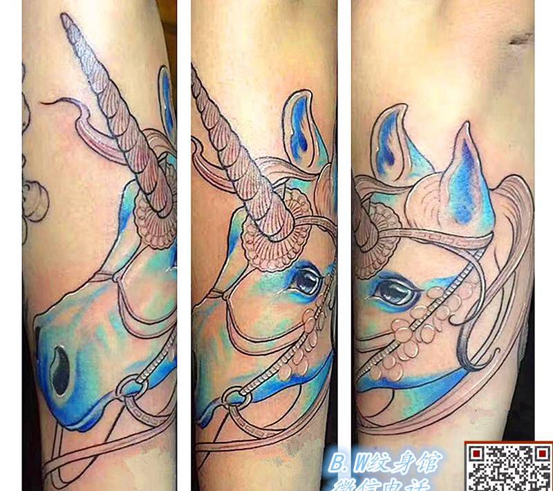 当前位置: 首页 >福建省漳州市纹身店-刺道纹身馆纹身图案>独角兽纹身图片_手臂手部新传统水彩纹身图案