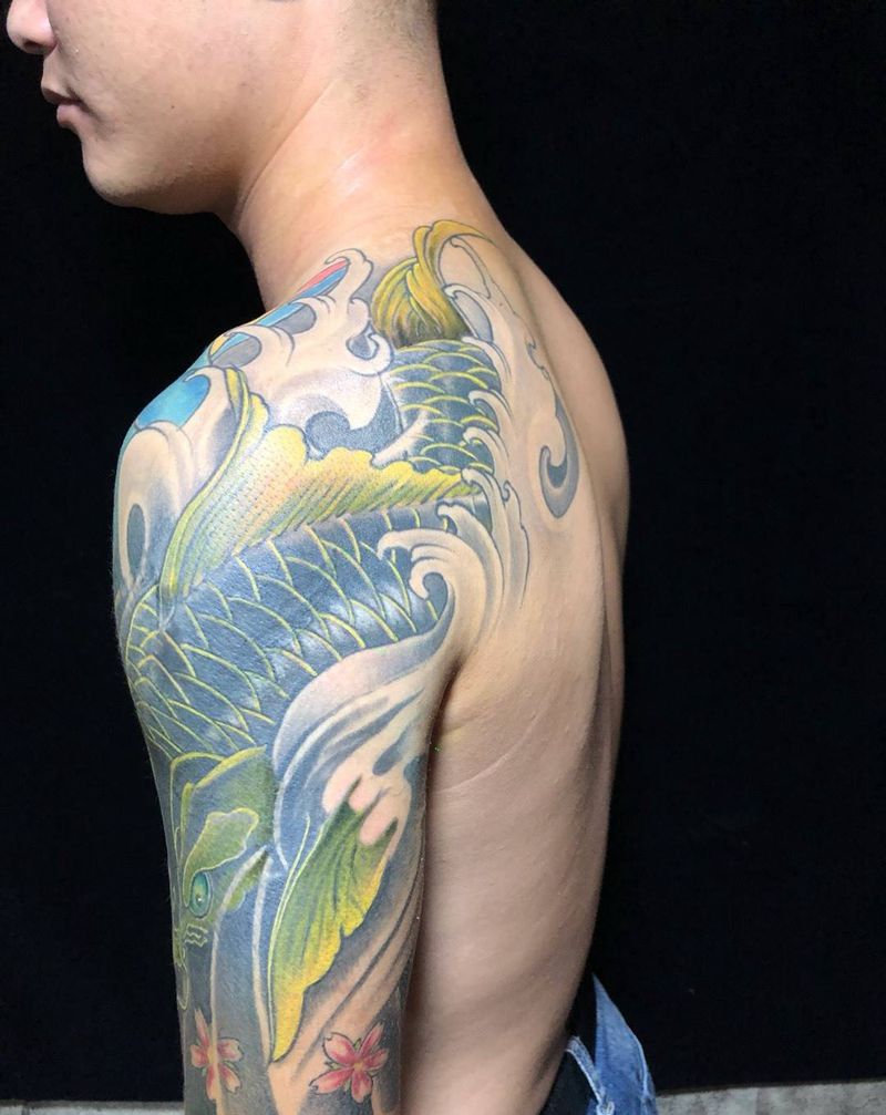 当前位置: 首页 >福建省南平市纹身店-傲世家族刺青纹身图案>黑金鲤鱼纹身图片_手臂肩部老传统水彩纹身图案