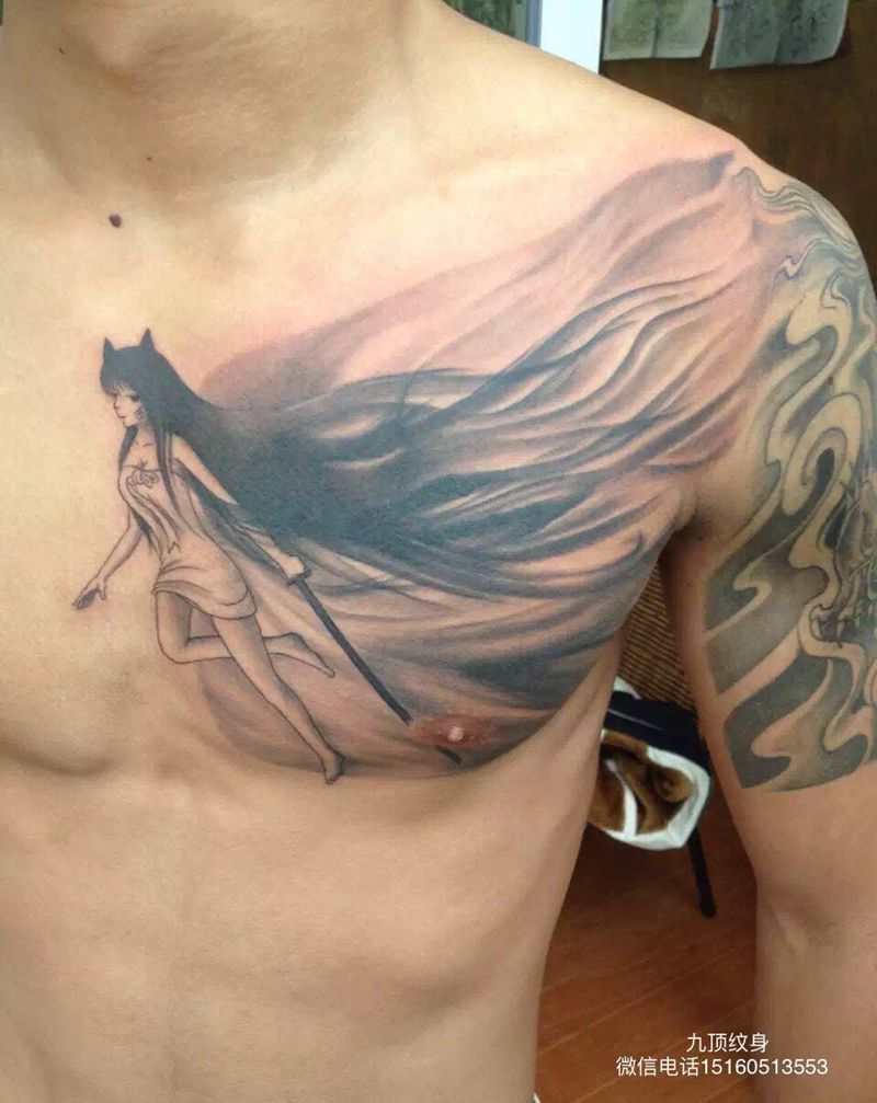 当前位置: 首页 >福建省漳州市纹身店-九顶纹身纹身图案>九尾盖字纹身图片_成品胸部传统清新人物鬼神纹身图案