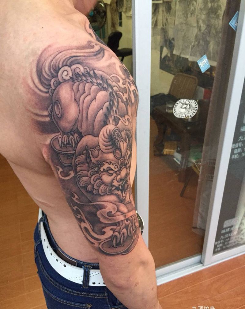 当前位置: 首页 >福建省漳州市纹身店-九顶纹身纹身图案>佛狮纹身图片_成品肩部胸部传统鬼神纹身图案