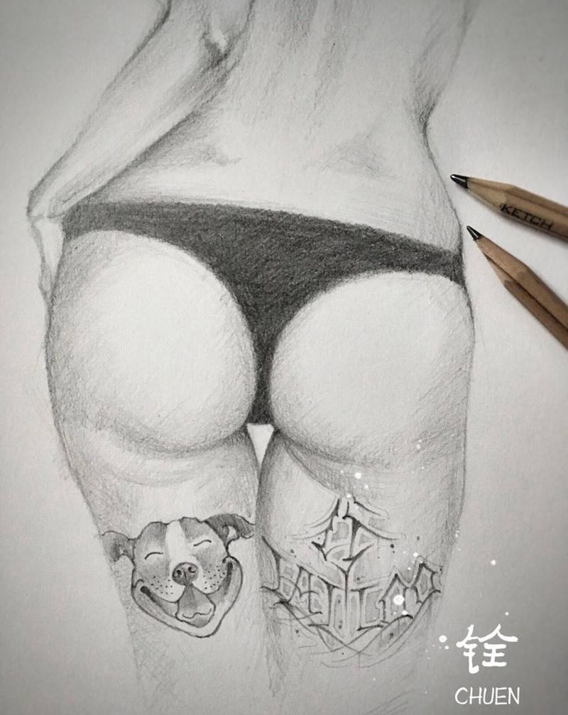 素描纹身图片_插画欧美腿部人物字符纹身图案