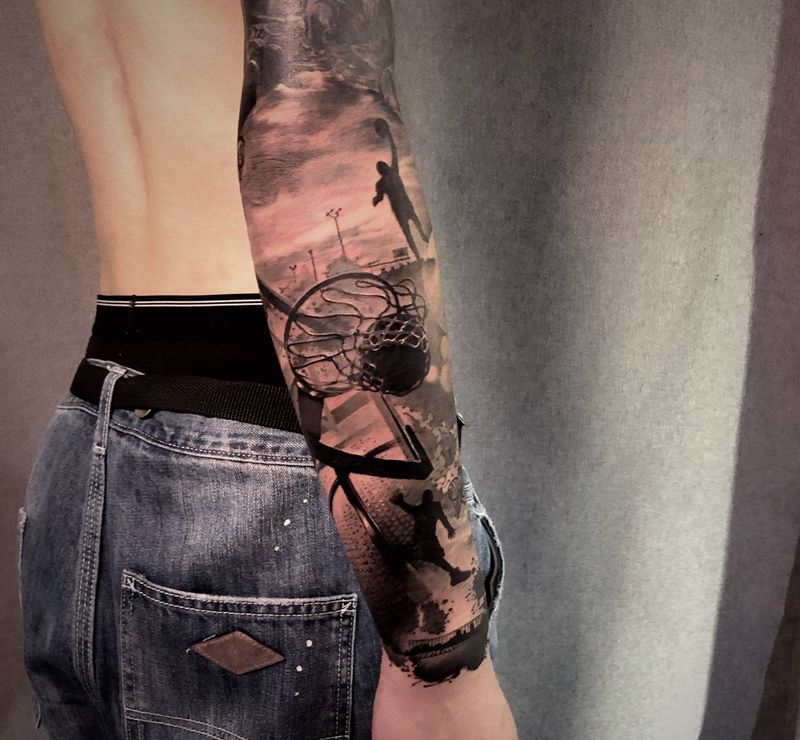 篮球与兄弟纹身图片_手部手臂欧美写实水墨纹身图案
