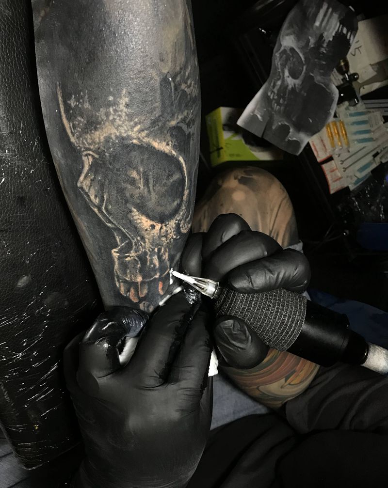 骷髅遮盖纹身图片_手臂欧美写实纹身图案