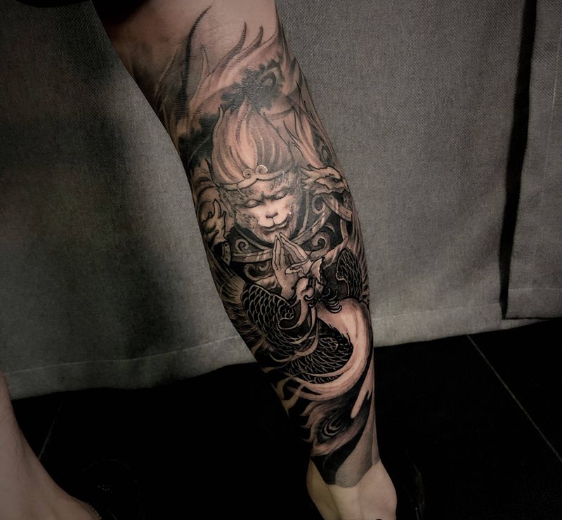 悟空包小腿纹身图片_腿部新传统纹身图案