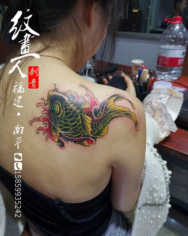 当前位置: 首页 >福建省南平市纹身店-南平纹画人刺青纹身图案>鲤鱼纹身图片_背部肩部新传统鱼 遮盖纹身图案