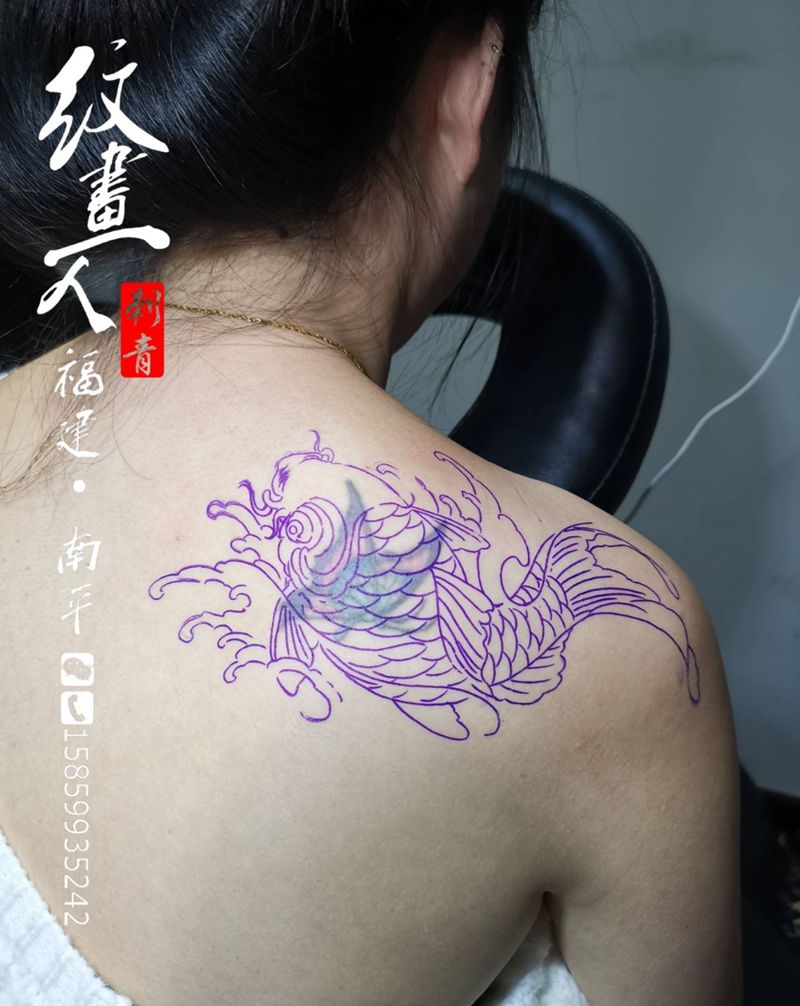 当前位置: 首页 >福建省南平市纹身店-南平纹画人刺青纹身图案>鲤鱼纹身图片_背部肩部新传统鱼 遮盖纹身图案