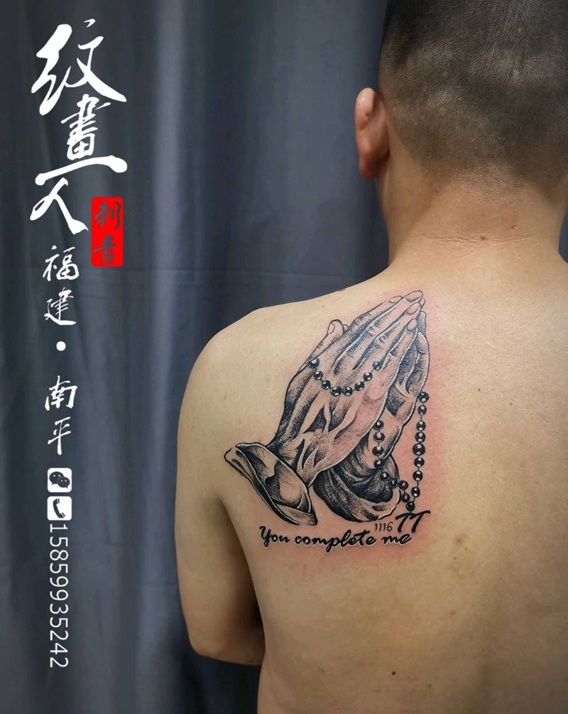 祈祷之手纹身图片_背部点刺欧美写实纹身图案