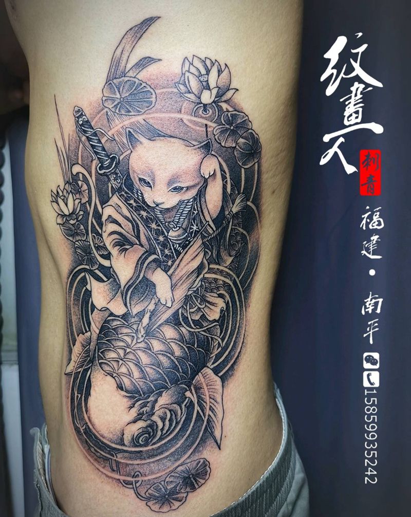 当前位置: 首页 >福建省南平市纹身店-南平纹画人刺青纹身图案>猫骑鲤鱼纹身图片_腰部腹部新传统点刺纹身图案