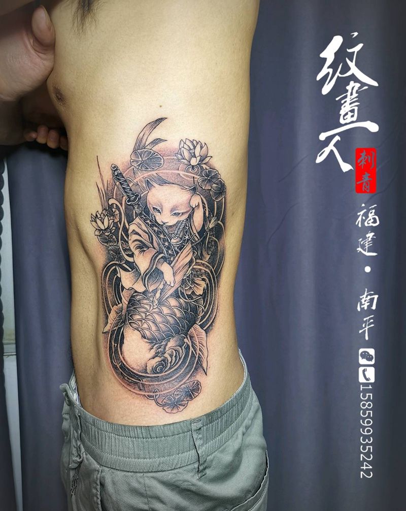 当前位置: 首页 >福建省南平市纹身店-南平纹画人刺青纹身图案>猫骑鲤鱼纹身图片_腰部腹部新传统点刺纹身图案
