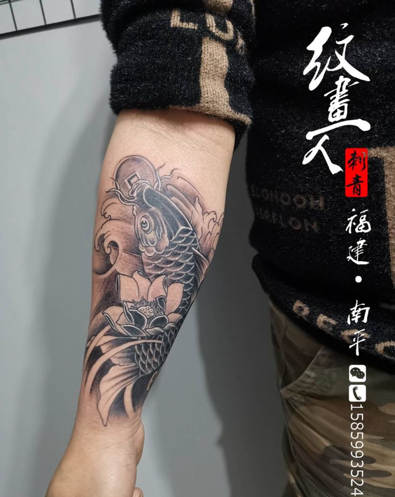 当前位置: 首页 >福建省南平市纹身店-南平纹画人刺青纹身图案>招财锦鲤纹身图片_手臂新传统纹身图案