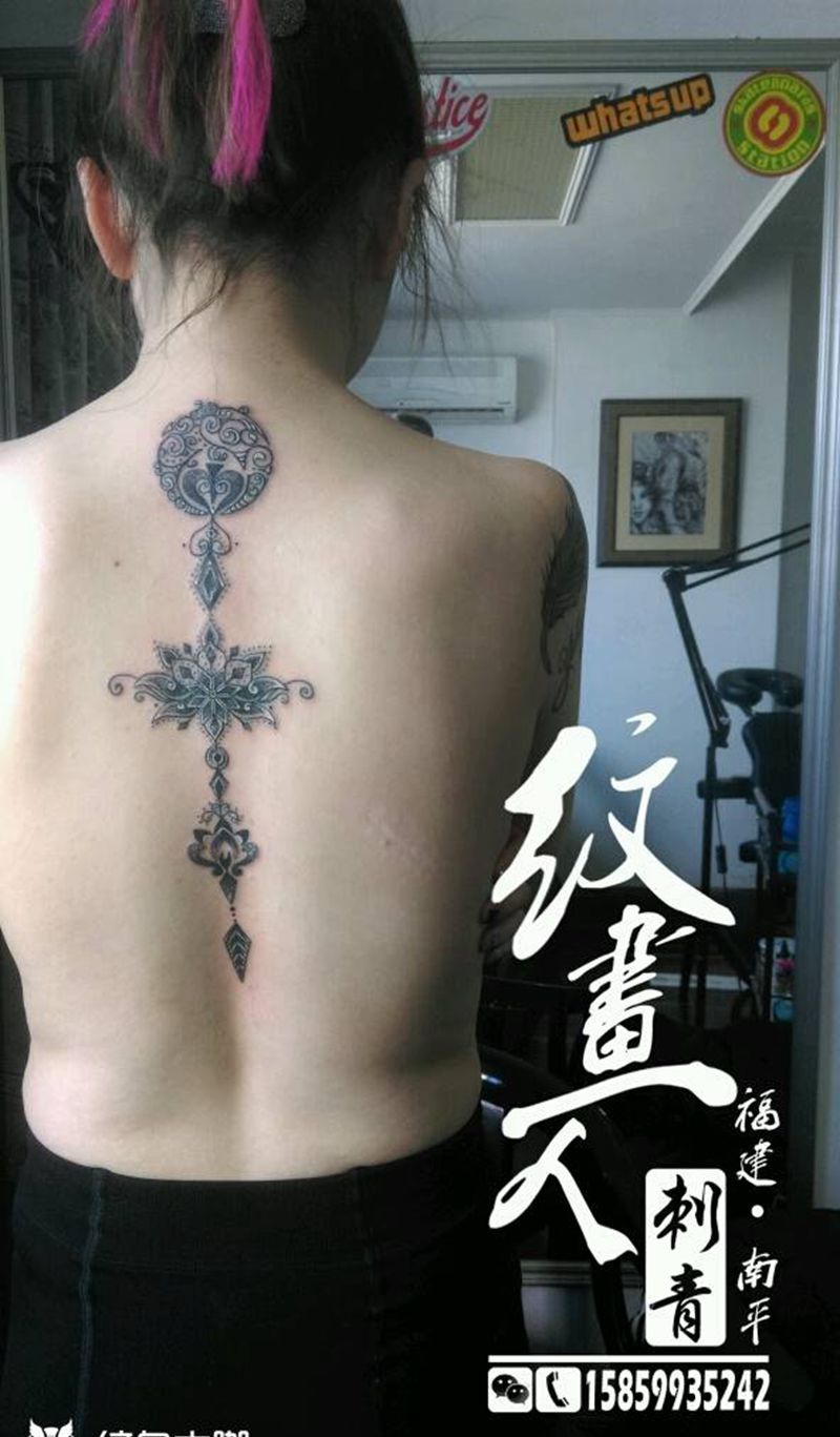 当前位置: 首页 >福建省南平市纹身店-南平纹画人刺青纹身图案>脊椎图腾点刺风格纹身图片_背部传统习俗几何图腾宗教原创成品手稿纹身图案