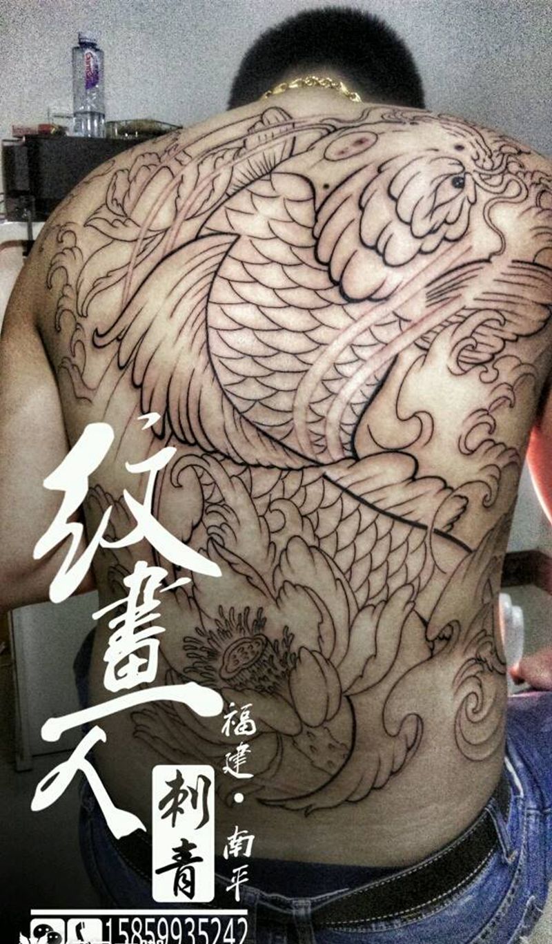 当前位置: 首页 >福建省南平市纹身店-南平纹画人刺青纹身图案>全背鲤鱼线图纹身图片_背部传统动物成品纹身图案
