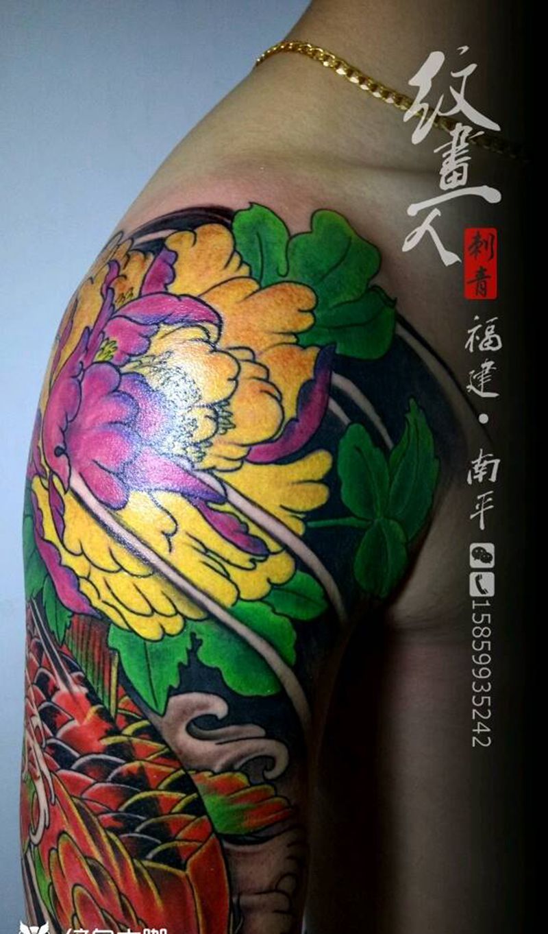 重彩鲤鱼牡丹花纹身图片_手臂传统动物植物成品纹身图案