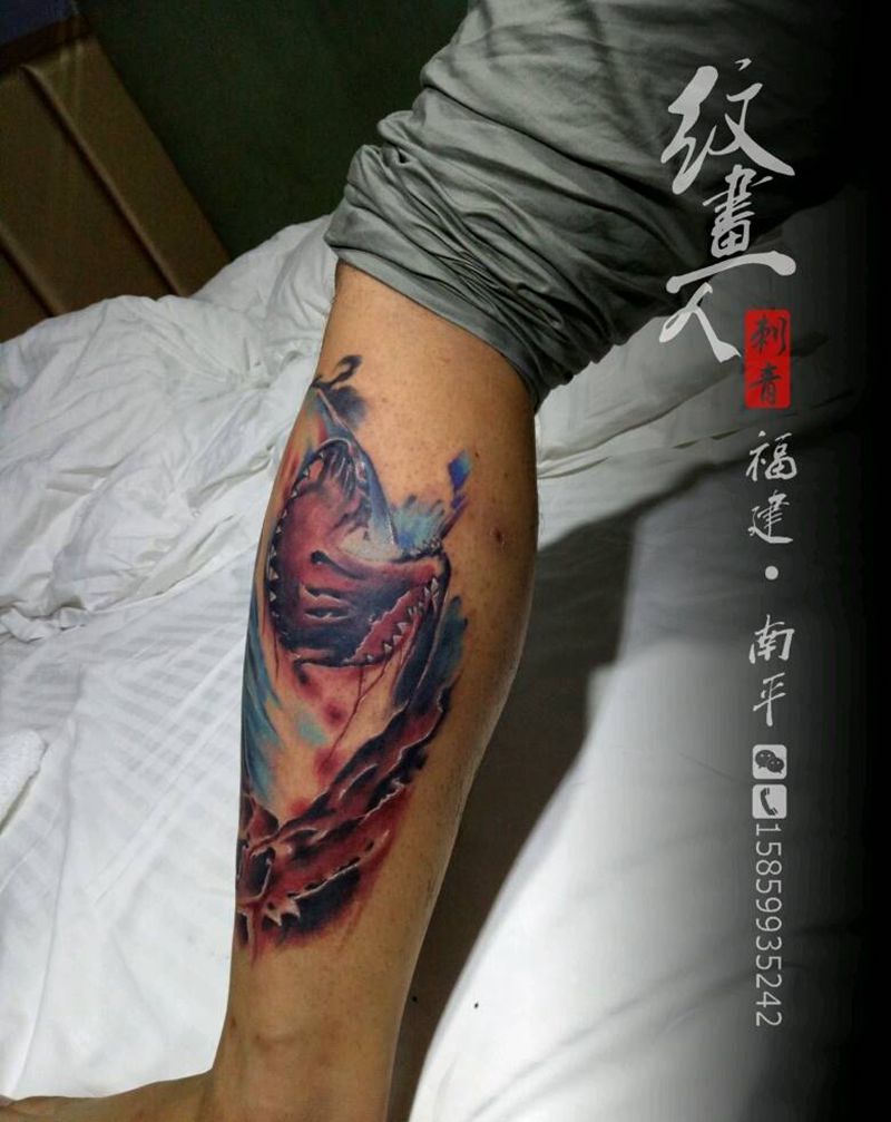 当前位置: 首页 >福建省南平市纹身店-南平纹画人刺青纹身图案>欧美彩色写实鲨鱼纹身图片_腿部欧美写实动物成品纹身图案