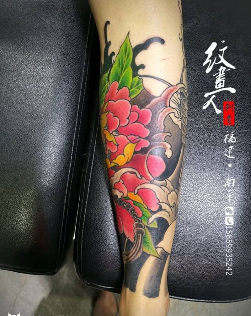 鲤鱼牡丹包小腿 未完成纹身图片_腿部新传统纹身图案