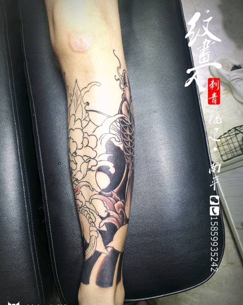 当前位置: 首页 >福建省南平市纹身店-南平纹画人刺青纹身图案>鲤鱼牡丹包小腿 未完成纹身图片_腿部新传统纹身图案