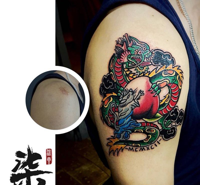 • T网红王老大花腿龙纹身图片_腿部新传统纹身图案