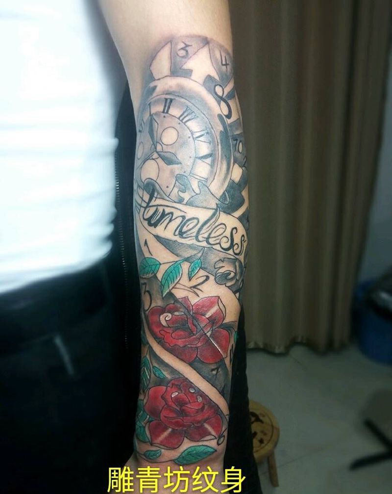 当前位置: 首页 >江西省景德镇市纹身店-雕青坊纹身纹身图案>欧美钟表玫瑰小臂纹身图片