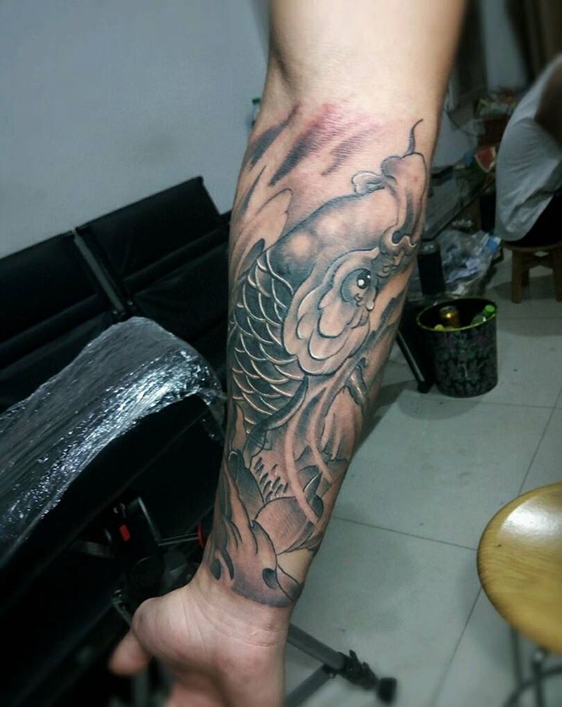 当前位置: 首页 >江西省景德镇市纹身店-雕青坊纹身纹身图案>包小臂鲤鱼遮盖字母纹身图片