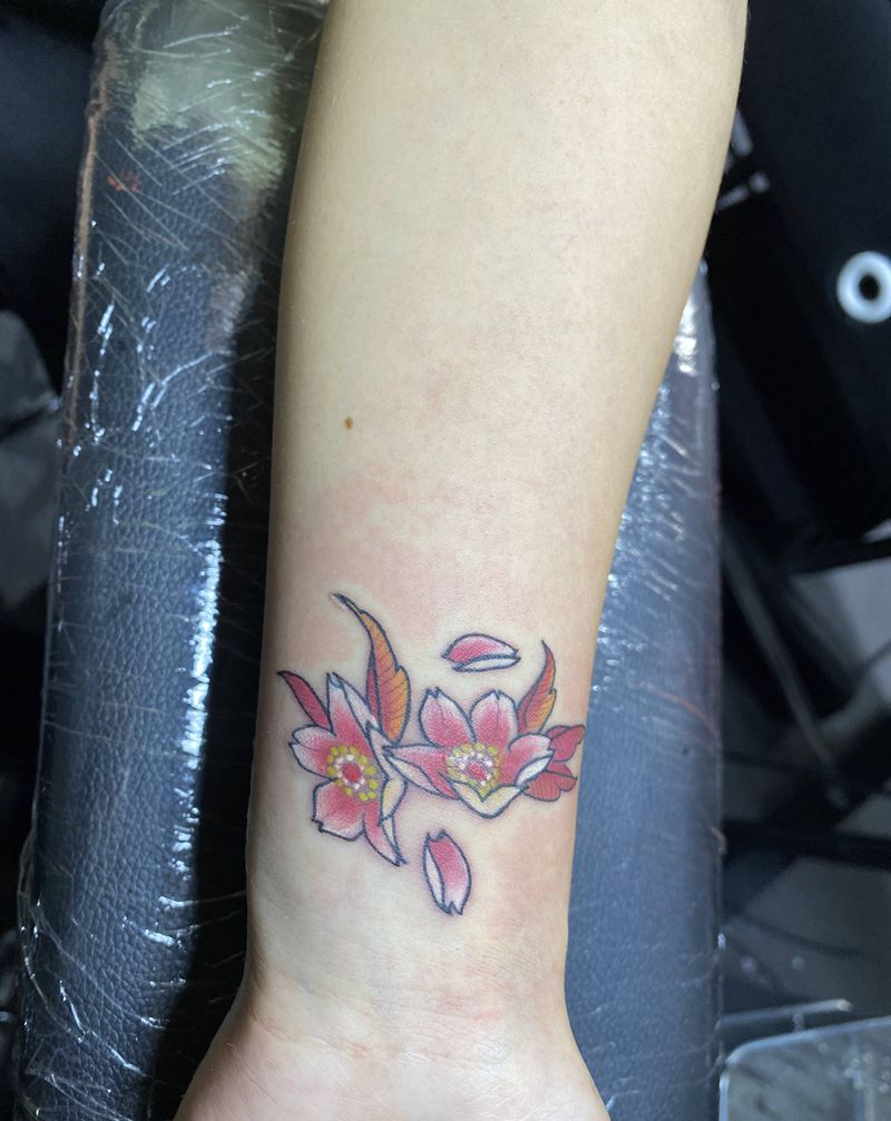 当前位置: 首页 >江西省景德镇市纹身店-仙浪刺青纹身图案>樱花遮盖纹身图片_手臂新传统纹身图案