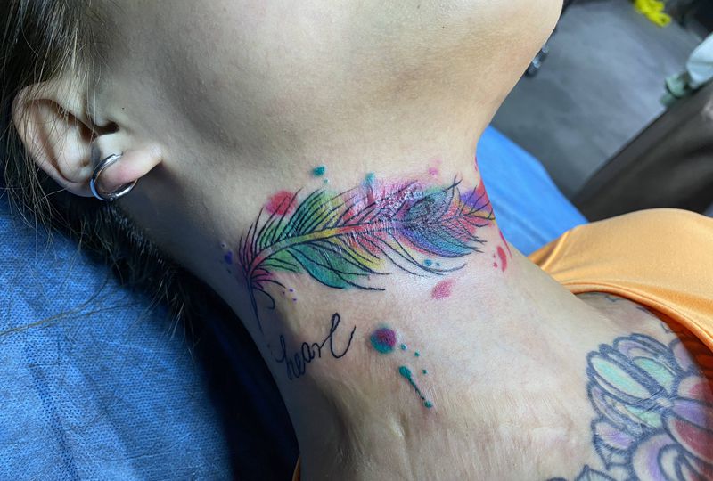 羽毛疤痕遮盖纹身图片_颈部水彩纹身图案